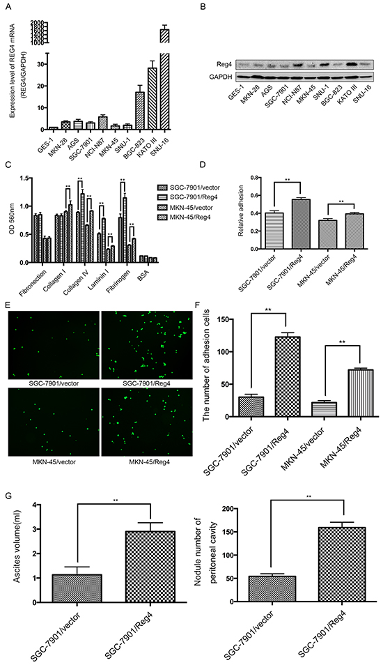 Figure 2: REG4 promotes adhesion and peritoneal metastasis of gastric cancer cells. A, B. mRNA and protein level of REG4 were evaluated by qRT-PCR and Western Blot in 9 gastric cancer cell lines and 1 immortalized gastric epithelial cell line. C, D. Cells or percentage adherent to different ECM components or Matrigel coated plates after 30min incubation were quantified at OD 560nm. E, F. Representative images and number of cells adherent to murine peritoneum after 30min incubation. G. Ascites volume and disseminated tumor number collected in mice. Error bars correspond to mean ± SD of at least three independent experiments. *P < 0.05, **P<0.01.