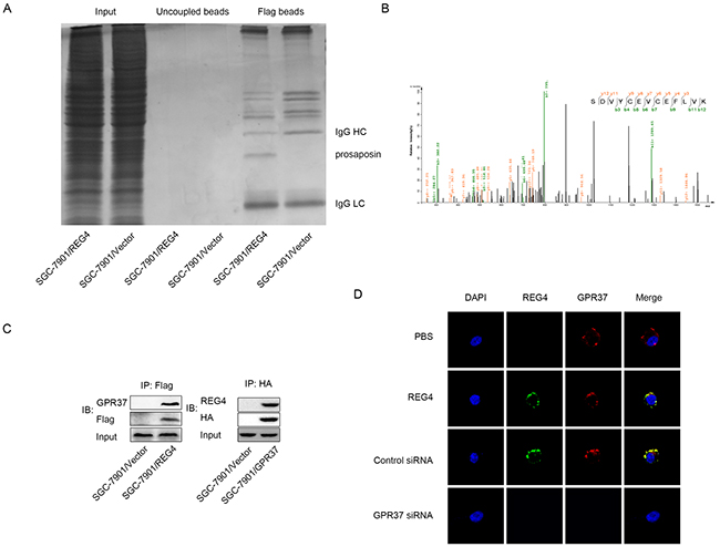 Figure 3: GPR37 is in the same complex with REG4. A. Immunoprecipitation of the whole cell extracts from SGC-7901/REG4-Flag and SGC-7901/Vector-Flag with anti-Flag antibody. B. Mass spectra results of the differential protein band in (A). C. Immunoprecipitation of the whole cell extracts from SGC-7901/REG4-Flag with anti-Flag antibody, and from SGC-7901/GPR37-HA with anti-HA antibody. D. Confocal microscopy for SGC-7901 cells stained with anti-REG4, anti-GPR37 antibody and iFluor 594 anti-rabbit IgG, Alexa488 anti-goat IgG second antibody. The cells were treated with PBS (row 1) or recombinant REG4 (rows 2–4), and were untransfected (row 2), transfected with control-siRNA (row 3), or GPR37-siRNA (rows4). Cell nuclei were counterstained with DAPI.
