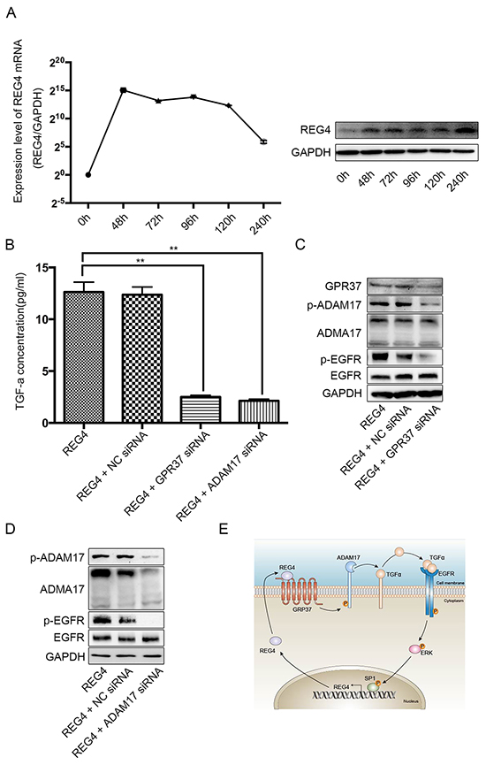 Protein extracts were resolved through 8%~15% SDS-PAGE, transferred to PVDF membranes, and probed with antibodies against human REG4 (R&D), EGFR(CST, USA), p-EGFR(GeneTex, USA), ERK(CST, USA), p-ERK(CST, USA), SP1(CST, USA), p-SP1(GeneTex, USA), GPR37(Abcam, USA), ADAM17(Abcam, USA), p-ADAM17(Abcam, USA) and GAPDH (Abcam, USA). Peroxidase-conjugated anti-mouse or rabbit IgG (CST, USA) was used as secondary antibody, and the antigen-antibody reaction was visualized by enhanced chemiluminescence assay (ECL, Thermo).