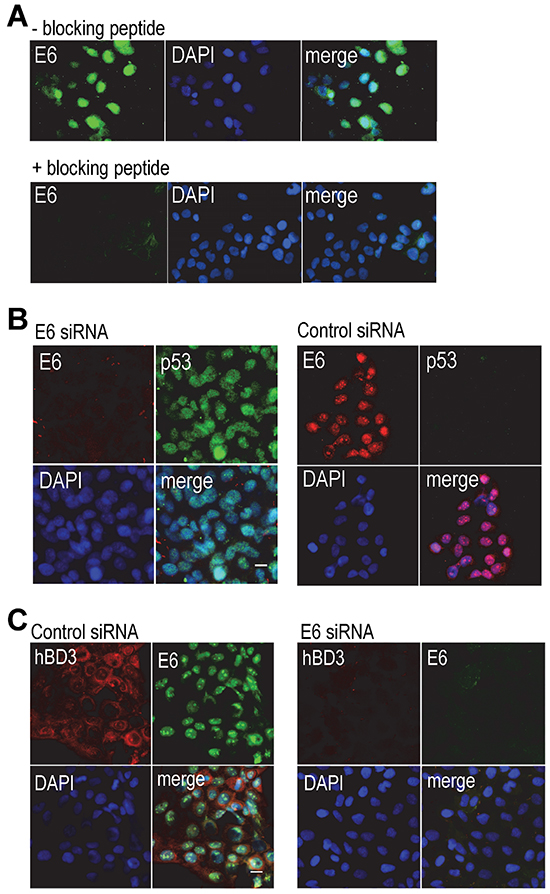 We tested specificity of commercially available HPV-16 E6 antibodies by performing immunofluorescence microscopy on HPV-positive CaSki cervical cancer cells, which contain multiple copies of integrated HPV-16 genome. The goat polyclonal antibody against HPV-16 E6 (N-17) (Santa Cruz Biotech Inc.) showed nuclear E6 staining in CaSki cells (Figure 1A), but not in that of HPV-negative TR146 oral cancer cells (Supplementary Figure S1). Addition of the blocking peptide to the N-17 antibody eliminated E6 staining (Figure 1A). The goat IgG isotype control antibody did not show this fluorescence signal in CaSki cells (Supplementary Figure S1). In addition, a mouse monoclonal antibody to HPV-16/18 E6 (C1P5, Santa Cruz Biotech Inc.) only showed cytoplasmic staining (Supplementary Figure S1). It has been shown that reduction of HPV gene expression by HPV-16 E6 siRNA is associated with increase in the level of nuclear p53 in CaSki cells [15]. To further validate the goat anti-HPV-16 E6 antibody, CaSki cells were transfected with an HPV-16 E6 siRNA or a control siRNA, followed by immunofluorescence microscopy for HPV-16 E6 and p53. The polyclonal HPV-16 E6 antibody did not detect the E6 protein in CaSki cells transfected with the E6 siRNA, while the monoclonal antibody to p53 identified nuclear p53 protein in the cells (Figure 1B). In addition, control siRNA had no effect on nuclear staining of E6 with undetectable p53 in CaSki cells (Figure 1B). To determine hBD3 expression in HPV-positive cancer cells, we performed immunofluorescent double-staining on CaSki cells using a polyclonal antibody to hBD3 and the antibody against E6. CaSki cells expressed hBD3 in the cytoplasm with co-expression of nuclear E6 in cells transfected with the control siRNA (Figure 1C, left panel). However, transfection of CaSki cells with the E6 siRNA blocked hBD3 as well as nuclear E6 expression (Figure 1C, right panel). These results suggest association of hBD3 expression with E6 in HPV-positive cancer cells.