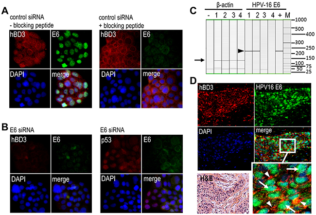 Figure 2: Expression of hBD3 in HPV-16 positive oropharyngeal cancer specimens. A. UM-SCC-104 cells grown in cell culture glass slides were transfected with control siRNA and then stained with the goat polyclonal antibody to HPV-16 E6 in the absence (right panels, - blocking peptide) or presence of the blocking peptide (right panels, +blocking peptide). hBD3, red; E6, green; nuclei, blue (DAPI). 20x. B. UM-SCC-104 cells were transfected with the E6 siRNA, followed by immunofluorescent staining of hBD3 (red) and HPV-16 E6 (green, left panel) as well as p53 (red) and HPV-16 E6 (green, right panel). Nuclei, blue. 20x. C. Multiplex high-risk HPV genotyping on head and neck cancer genome DNA. 1, 2, oropharyngeal cancer biopsies; 3, 4, oral squamous cell carcinoma biopsies; +, a positive control DNA derived from a cervical cancer patient specimen with confirmed HPV-16; M, DNA molecular weight markers. Only HPV-16 (arrow head) genotyping and β-actin genomic DNA (arrow) gel images are shown. D. Immunofluorescence microscopy of hBD3 (red, arrowheads in enlarged inset) and HPV-16 E6 (green, arrows in enlarged inset). H&E; H&E stain from the same specimen. 20x.