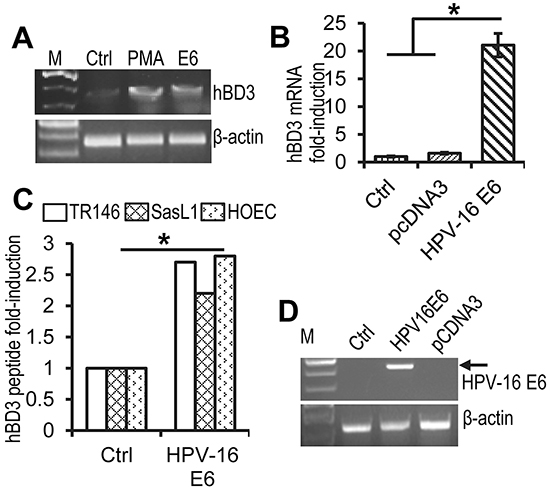 Figure 3: Induction of hBD3 expression by HPV-16 E6. A. RT-PCR for hBD3 and human β-actin mRNA on total RNA extracted from OKFT6/TERT-2 cells that were transfected with the HPV16 E6 expression construct. PMA, phorbol 12-myristate-13-acetate (PMA) treated cells, positive controls; Ctrl, mock transfection control. B. Fold induction of hBD3 mRNA in HOECs transfected with the HPV-16 E6 expression construct. Cells transfected with the pcDNA3 vector (pcDNA3) and mock transfection (Ctrl) were used as negative controls. *, p≤ 0.05 (n=3). C. HOECs and SasL1 and TR146 oral cancer cells were transfected with the HPV-16 E6 expression construct for 48 hr, followed by hBD3 ELISA of cell lysates. Production of hBD3 peptide was presented as fold-increase of hBD3 produced by cells transfected with the HPV-16 E6 expression construct compared with those transfected with pcDNA3. *, p≤ 0.05 (n=3). D. RT-PCR of total RNA derived from HEK293 cells transfected with HPV-16 E6, or a pcDNA3 vector. Ctrl, mock transfected cells.