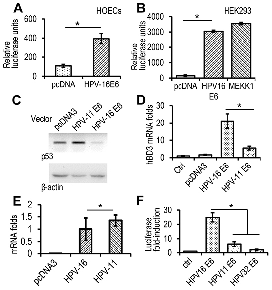 Figure 4: High-risk, but not low-risk, HPV E6 induces expression of hBD3. A. Luciferase analysis in HOECs transfected with HPV-16 E6 expression construct or a blank pcDNA3 vector together with the hBD3 luciferase reporter. Relative luciferase units represent hBD3 promoter activity after normalized with the Renilla luciferase activity using the dual-luciferase system. *, p≤ 0.05 (n=3). B. Luciferase analysis in HEK293 cells transfected with HPV-16 E6, or an MEKK expression construct together with the hBD3 luciferase reporter. *, p≤ 0.05 (n=3). C. Western blotting on p53 protein in HEK293 cells transfected with E6 expression construct of HPV-16 or -11. D. Real-time qRT-PCR of HOECs transfected with E6 expression construct of HPV-16 or -11. *, p≤ 0.05 (n=3). E. Real-time qRT-PCR of E6 mRNA of HPV-16 and -11 in HOECs transfected with respective expression constructs. Transfection with the blank pcDNA3 vector was used as a negative control. *, p≥ 0.56. F. hBD3 gene promoter reporter analysis in HOECs transfected with E6 expression construct of HPV-16, -11, or -32. *, p≤ 0.05 (n=3). Luciferase fold-induction indicates relative luciferase units of cells transfected with expression constructs compared to that transfected with the blank pcDNA3 vector (Ctrl).