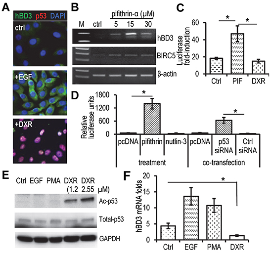 Figure 5: Effect of p53 on hBD3 expression. A. HOEC cells were treated with EGF (10 ng/ml) or doxorubicin (DXR, 1.25 µM) for 16 hr, followed by immunofluorescent staining with antibodies to hBD3 (green) and p53 (red). Nuclei, blue (DAPI). 20x. B. Effect of the p53 inhibitor pifithrin-α on hBD3 and BIRC5 (survivin) expression in HOECs using RT-PCR. C. Effect of pifithrin-α (PIF) and DXR on the promoter activity of the hBD3 gene in HOECs. D. Effect of p53 inhibitor (pifithrin-α), activator (nutlin-3) and siRNA targeting p53 on transactivation of the hBD3 gene promoter in HEK293 cells. The assay was conducted in triplicates and repeated three times. *, p≤ 0.05 (n=3). E. Western blotting of acetylated p53 (Ac-p53), total p53, and GAPDH in CaSki cells treated with EGF (20 ng/ml), PMA (5 nM), and DXR at different concentrations for 16 hr. F. qRT-PCR of hBD3 mRNA in CaSki cells treated with DXR (2.5 µM), EGF (20 ng/ml), and PMA (5 nM) for 16 hr. Ctrl, no treatment. *, p≤ 0.05. The experiment was repeated 3 times.