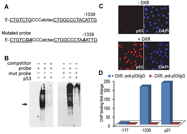 Figure 6: Identification of p53 binding site in the hBD3 gene promoter. A. Putative p53-binding site in the hBD3 promoter identified by computational analysis. The p53 responsive element was underlined. Mutant oligonucleotides in the p53 responsive sequence are marked as bold/italicized letters. B. EMSA of recombinant p53 protein with hBD3 promoter derived, biotin-labeled oligonucleotides (probe) as shown in A. Shifted band is indicated by an arrow. Un-labeled oligonucleotides were used as competitors to ensure the specificity of the binding. Mutated probe (mut probe) failed to induce shifted p53/probe complex. C. OKF6/TERT-2 cells were treated with doxorubicin followed by immunofluorescent staining for p53 (red). Nuclei, blue (DAPI). 20x. D. ChIP analysis of p53 interaction with the hBD-3 promoter in vivo. OKF6/TERT-2 cells treated with or without DXR (+/- DXR) were used in ChIP assays using qPCR. The abundance of p53 binding sites was represented as the ratio of DNA derived from p53 antibody precipitation (anti-p53) vs. that from control IgG incubation (IgG). -1339, the putative p53 binding site in the hBD3 gene promoter; -179, the site of a genomic DNA fragment without p53 binding; p21, ChIP on the p53 binding site in the p21 gene. The experiment was repeated two times.