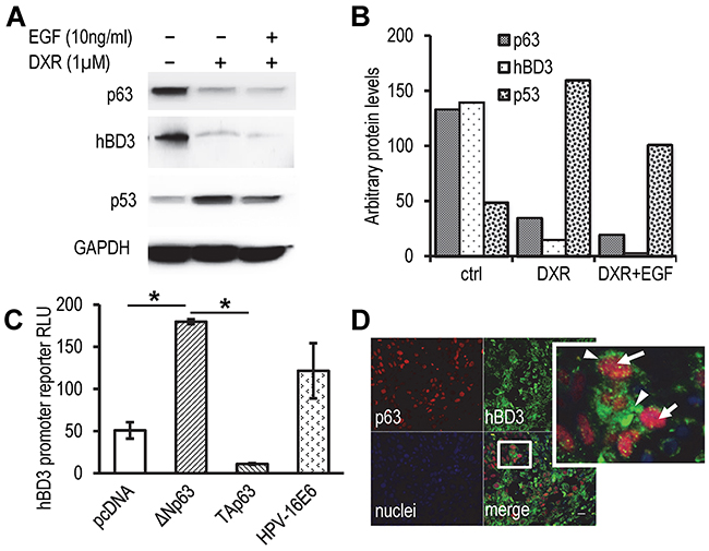 Figure 7: Role of p63 in modulation of hBD3 expression. A. HOECs were grown in basal medium with supplements, following addition of EGF (10 ng/ml) and DXR (1 µM) for 20 hr. Western blotting for p53, p63, and hBD3 was performed with GAPDH as a housekeeping control. B. Quantification of western blotting densities in A. C. Luciferase activities in HEK293 cells co-transfected with the hBD3 gene promoter reporter and expression constructs as indicated. RLU, relative luciferase units. pcDNA blank vector transfection was used as a negative control. Luciferase activities were determined using the Dual-luciferase system. *, p<0.05. D. Expression of hBD3 and p63 in HNSCC specimens using immunofluorescence microscopy. A representative image is shown. Arrows, p63 (red); arrow heads, hBD3 (green); nuclei, blue (DAPI). 20x.