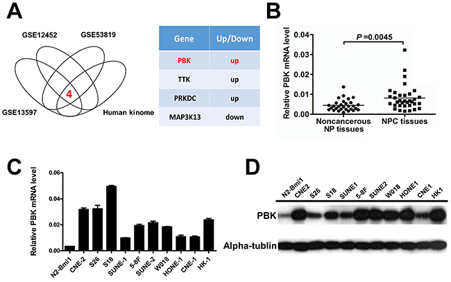 Figure 1: PBK/TOPK expression is frequently upregulated in NPC tissues and cell lines. A. PBK was identified to be a potential oncogene in NPC from analysis in microarray data and the human kinome. B. The mRNA levels of PBK (normalized to β-actin) in NPC tissues and noncancerous NP tissues were confirmed by quantitative real-time PCR, showing that PBK expression was significantly higher in NPC tissues than in NP tissues. P values were calculated using the Student t test. The relative PBK mRNA levels and protein levels were determined by quantitative real-time PCR C. and immunoblotting D. showing that PBK is differentially expressed in NPC cell lines and N2-bmi1 immortalized nasopharyngeal epithelial cells. Column, mean; error bar, ± SD (from triplicates).