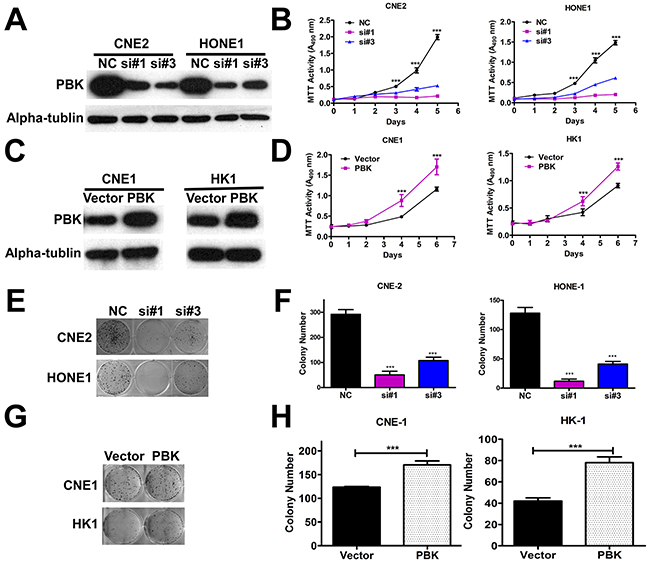Figure 2: Regulation of PBK expression affects growth in NPC cells in vitro. A and C. Transient suppression and overexpression of PBK in NPC cells were determined by immunoblotting analysis, a-tubulin was used as a loading control. B and D. Cell proliferation was determined by the MTT assay; ***P < 0.001, Student t test. Colony formation ability in suppression of PBK; Representative micrographs E. and quantification F. of crystal violet stained cells from 3 independent experiments; Overexpression of PBK increased colony cell numbers G and H. ***P < 0.001, Student t test. The data are presented as the mean ± SD (from triplicates).