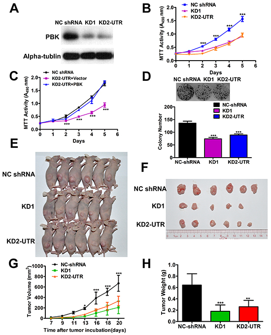 Figure 3: Suppression of PBK inhibits the growth of NPC cells in vivo. A. Stable suppression of PBK in NPC cells were determined by immunoblotting, α-tubulin was used as a loading control. B. Cell proliferation was determined by the MTT assay; ***P < 0.001, Student t test. Colony formation ability, representative micrographs and quantification D. of crystal violet stained cells from 3 independent experiments; ***P < 0.001, Student t test. C. Cell growth was rescued in PBK knockdown cell by overexpressing PBK. E. The PBK knockdown CNE2 (KD1 and KD2-UTR) cells and the negative control shRNA cells were subcutaneously injected into nude mice. F. The photographs of isolated tumors. G. The growth curve indicates CNE2 growth suppression upon PBK knockdown in vivo. H. The terminal tumor weights are also decreased compared with the negative control. *P < 0.05, **P < 0.01, ***P < 0.001, Student t test. The results are presented as the mean ± SD, n = 6 per group. Scale bar, 1 cm.
