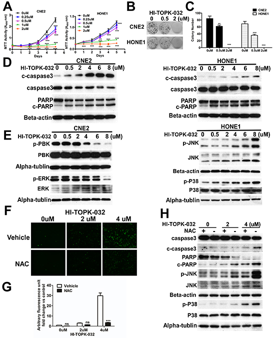 Figure 4: Oxidative stress induced by HI-TOPK-032 promotes apoptosis via the MAPK signaling pathway. A. HI-TOPK-032 inhibits NPC cell growth in a dose-dependent manner. Cells were treated with HI-TOPK-032 and proliferation was measured by MTT assay. **P < 0.01, ***P < 0.001, Student t test. Colony formation ability; Representative micrographs B. and quantification C. of crystal violet stained cells from 3 independent experiments; ***P < 0.001, Student t test. D. HI-TOPK-032 induces NPC cell apoptosis in a dose-dependent manner. E. Effect of HI-TOPK-032 on MAPK signaling pathway in NPC cells. Cells were treated with HI-TOPK-032 for 48 hours in medium containing 10% FBS and analyzed by immunoblotting analysis. Similar results were observed from 2 independent experiments. F. ROS levels as indicated by CM-H2DCFDA in NPC cells treated with HI-TOPK-032 in 0μM, 2μM and 4μM for 6 hr in the presence or absence of NAC. A representative picture from multiple fields is shown for each treatment. Fluorescence signals are quantified G. Photomicrographs are 100×. ***P < 0.001, Student t test. The data are presented as the mean ± SD (from triplicates). H. Immunoblotting of apoptosis marker and MAPK signaling pathway from NPC cells treated with increasing concentrations of HI-TOPK-032 for 48hr in the presence or absence of NAC.