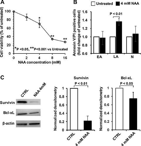 Figure 1: Effect of NAA on cell viability and apoptosis in SH-SY5Y cells. (A) Dose-dependence effect of NAA treatment on cell viability. Cells were exposed for 72 h to the indicated concentrations of NAA and viability determined by MTS assay. Cell viability is expressed as the percentage (%) of untreated cells. The data shown are means (± SEM) of 6 independent experiments. (B) Measurement of early apoptotic (EA), late apoptotic (LA) and necrotic (N) cells performed by flow-cytometry after staining cells with Annexin-V and Propidium Iodide. Cells were incubated with 4 mM NAA for 72 h. Data, expressed as percentage of total events analysed, are the means (± SEM) of three independent experiments. (C) Protein expression levels of the anti-apoptotic factors, Bcl-xL and Survivin, assayed by Western blotting in untreated and 4 mM NAA-treated cells for 72 h (left panel); β-actin served as loading control. Graph bars on the right show the average (± SEM) of data resulting from densitometric analysis of three independent blots.