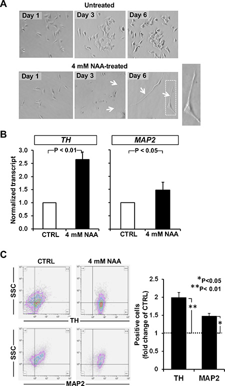 Figure 4: Effect of NAA on cell morphology and neuronal marker expression. (A) Morphological comparison between undifferentiated and differentiated SH-SY5Y cells after 3 and 6 days of 4 mM NAA treatment. NAA treatment - induced dramatic morphological changes can be seen including smaller cell bodies and substantial increases in neurite outgrowth and complexity. (B) SH- SY5Y cells were treated with 4 mM NAA for 72 h. mRNA was harvested and expression of neuronal differentiation genes (TH, MAP2) has been analysed. (C) Flow cytometric detection of TH and MAP2 in neural SH-SY5Y cell line. Representative experiment out of three performed is shown. The differentiation markers TH and MAP2 were significantly upregulated after 3 days of treatment. Graph bars on the right show the average (± SEM) of data resulting from quantification of TH and MAP2 signals from three independent experiments.