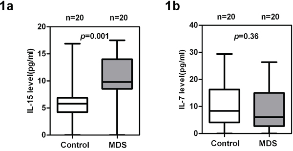 We measured the IL-7 and IL-15 levels from the plasma of MDS patients and healthy controls. As shown in Figure 1a, IL-15 was significantly higher in MDS plasma [n = 20, median (25th–75th) percentile = 9.8 (8.55–13.75) pg/mL] than in healthy control plasma [n = 20, median (25th–75th) percentile = 5.8 (4.25–6.85) pg/mL, p = 0.001]. By contrast, IL-7 levels were similar among cases and controls (p = 0.36) (Figure 1b).