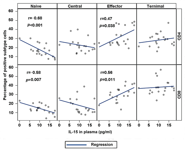Correlation of IL-15 in plasma with naïve and effector memory T cells in MDS