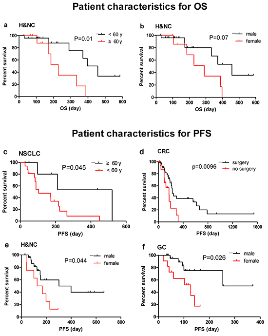 For each indication, the relationship between each variable with ORR or DCR was performed using Pearson Chi-square tests. The log rank test was used to analyze the association between each variable with OS or PFS, with its associated 95% confidence interval (95% CI). Cox’s proportional hazard regression models were conducted for multivariate survival analyses. Proportional hazard assumption was evaluated by examining plots of residuals and by including time-dependent covariates in the models. p<0.05 represent significant differences. All the data were analyzed by SPSS software (version 18.0, IBM). GraphPad Prism (version 6.0, GraphPad Software) was used to draft the figure of Kaplan-Meier curve.