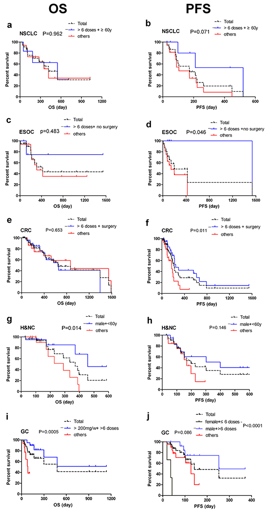 It was found that age, patient sex and previous surgery could be factors to consider in antitumor response. Prior surgery in CRC has a positive correlation with PFS (p=0.037) and in ESOC this factor had a negative influence (p=0.012). This factor has no influence on other indications. Patients younger than 60 years appear to have a greater survival benefit to nimotuzumab treatment of H&NC. Nimotuzumab > 6 doses are related with longer PFS in CRC and GC, and Nimotuzumab > 200mg/weekly is related with longer OS in GC. Even in those patients refractory to combination treatment (n=33), the PFS of patients got >6 doses (n=16) was significantly longer than those only received ≤ 6 doses (n=17), with the median PFS of 92±7.9 days vs 41±0.8 days (p=0.002) and the median OS of 655±348.9 days vs 198±67.4 days (p=0.12, data not shown). For H&NC, statistical significance was found to benefit males less than 60 years, while in GC it was found that patients receiving the highest number of doses over 200 mg had a longer survival.