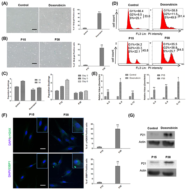 Figure 1: Doxorubicin treatment and replicative passaging induce senescence in HFFs. A. Left and middle, at day 4, 60 000 control and doxorubicin treated HFFs were reseeded into a 3.5-cm dish for SA-β-gal-staining 12h later. Right, percentages of SA-β-gal-positive cells (**p <0.01, t-test, n = 3). Scale bar, 200 μm. B. Left and middle, SA-β-gal-staining of HFFs at P15 and P38. Right, percentages of SA-β-gal-positive cells (**p <0.01, t-test, n = 3). Scale bar, 200 μm. C. Left, The numbers of cells treated with or without 100 ng/ml doxorubicin were counted at days 4 and 8, population doublings were calculated and plotted, n = 3. Right, P15 and P38 HFF cells were seeded at 60 000 cells/well into 6-well plates and counted for the indicated times, population doublings were calculated and plotted, n=3. D. Up, representative cell cycle analysis of HFFs treated with or without 100 ng/ml doxorubicin at day 4. Down, P15 and P38 HFF cells were seeded at 130 000 cells/6-cm dish and collected 3 days later for flow cytometry, n=3. E. Left, gene expression levels (quantitative real-time PCR) in control and doxorubicin-treated HFFs on day 4 (n = 3). Right, gene expression levels in HFFs at P15 and P38 (n = 3). F. Left, P15 and P38 cells were stained with by γ-H2AX and 53BP1 antibodies, respectively. Right, the percentages of γ-H2AX and 53BP1 positive cells were quantified (**p < 0.01, t-test, n = 3). Scale bar: 50μm. G. Up, representative example of the p21 expression levels in control and doxorubicin-treated HFFs on day 4 (n = 3). Down, p21 levels in HFFs at P15 and P38 (n = 3).