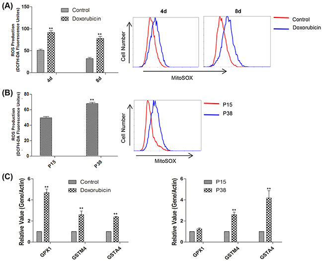 Figure 2: Accelerated oxidative stress was detected in two models of cellular senescence. A. Left, relative fluorescence intensity of intracellular ROS measured by flow cytometry in control and doxorubicin-treated HFFs on days 4 and 8 (**p <0.01, t-test, n = 3). Right, representative mitochondrial ROS assessment by flow cytometry of MitoSox in control HFFs and HFFs treated with doxorubicin on days 4 and 8. B. Left, relative fluorescence intensity of intracellular ROS measured by flow cytometry in HFFs at P15 and P38 (**p <0.01, t-test, n = 3). Right, representative mitochondrial ROS assessed by flow cytometry of MitoSox in HFFs at P15 and P38. C. Left, gene expression levels (quantitative real-time PCR) in control and doxorubicin-treated HFFs on day 4 (n = 3). Right, gene expression levels in HFFs at P15 and P38 (**p <0.01, t-test, n = 3).