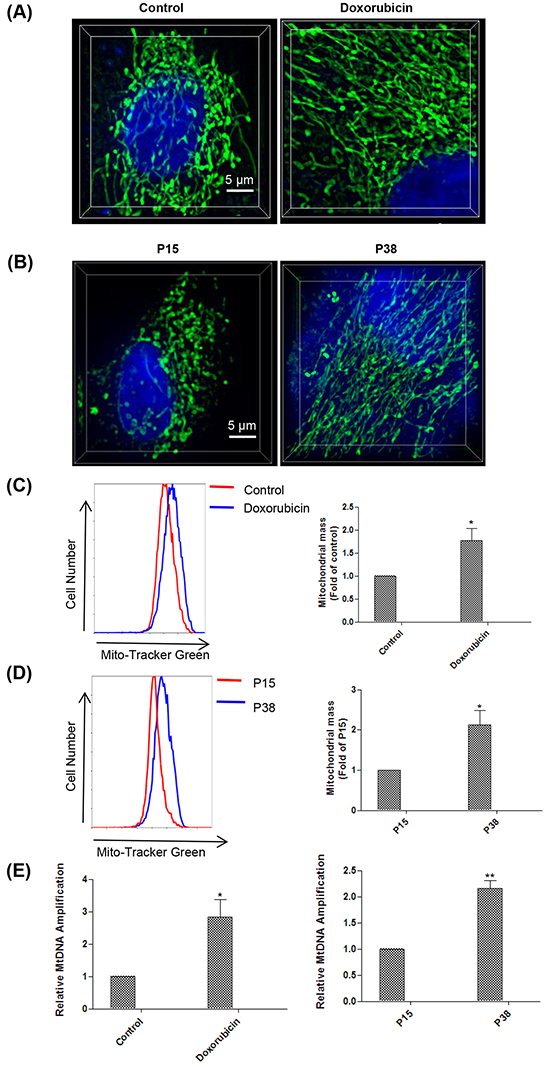 Figure 3: Senescent cells manifest mitochondria alteration both morphologically and quantitatively. A. Mitochondria morphology observation with structured illumination microscopy (SIM) technology in control and doxorubicin-treated HFFs on day 4 after stained with Mito-Tracker Green and Hoechst 33342 (n = 3). B. Mitochondria morphology observation with SIM technology in HFFs at P15 and P38 after stained with Mito-Tracker Green and Hoechst 33342 (n = 3). C. Fluorescence intensity assessment by flow cytometry in control and doxorubicin-treated HFFs on day 4 after stained with Mito-Tracker Green (*p < 0.05, t-test, n = 3). D. Fluorescence intensity assessment by flow cytometry in HFFs at P15 and P38 after stained with Mito-Tracker Green (*p < 0.05, t-test, n = 3). E. Left, increases in mtDNA copy number in doxorubicin-treated HFFs on day 4 compare with controls (*p < 0.05, t-test, n = 3). Right, increases in mtDNA copy number in HFFs at P38 compare with P15 (** p < 0.01, t-test, n = 3).