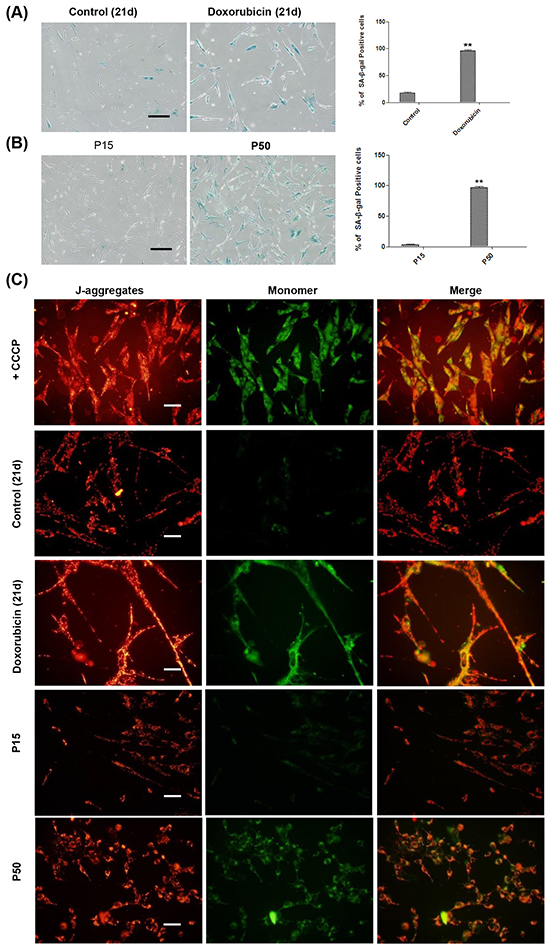 Figure 5: MMP depolarization detection at the late stage of senescence in TIS and RS cells. A. Left and middle, control and doxorubicin treated HFFs were seeded at day 21 for SA-β-gal-staining. Right, percentages of SA-β-gal-positive cells (**p <0.01, t-test, n = 3). Scale bar, 200 μm. B. Left and middle, SA-β-gal-staining of HFFs at P15 and P50. Right, percentages of SA-β-gal-positive cells (**p <0.01, t-test, n = 3). Scale bar, 200 μm. C. Representative examples of the fluorescence pattern after staining with JC-1 in TIS cells on day 21 and RS HFFs at P15 and P50. CCCP, an apoptosis inducer used as a positive control. Left, red fluorescence emission under green excitation corresponding to J-aggregates. Middle, green fluorescence emission under blue excitation which corresponding to J-monomers. Right, JC-1 images were merged by Image-J. Scale bar, 50 μm. n = 3.