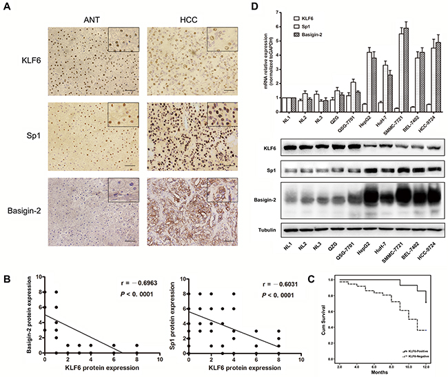 Figure 1: KLF6 is down-regulated in HCC tissues and cell lines. A. IHC analysis of KLF6, Sp1 and basigin-2 protein expression in HCC and paired adjacent normal tissues. Pictures of representative areas are presented at different staining intensities (weak and strong) in ANT and tumor tissues. Scale bars, 50 μm. B. Spearman rank correlation analysis of KLF6 and Sp1 or basigin-2 protein expression levels in HCC and ANT tissues. C. Correlation of the overall survival rate of HCC patients with KLF6 expression pattern. Curves were estimated using the Kaplan–Meier method (P = 0.015). Continuous line KLF6 positive group; dotted line KLF6 negative group. D. The mRNA and protein expression of KLF6, Sp1, and basigin-2 were detected by real-time RT-PCR and western blotting.