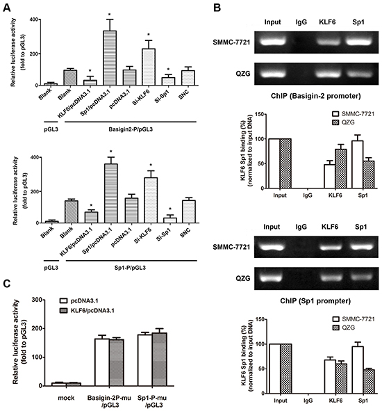 Figure 2: KLF6 directly binds to the Sp1 and basigin-2 promoter. A. The dual-luciferase reporter assay was performed by co-transfecting reporter vectors inserted with the basigin-2 promoter (basigin-2P/pGL3) or the Sp1 minimal promoter (Sp1-P/pGL3) with overexpression vectors or knockdown siRNA of KLF6 and Sp1, respectively. *, P < 0.05, using Student’s t test. B. The ChIP assay demonstrated endogenous KLF6 and Sp1 binds to the basigin-2 and Sp1 promoter. The histograms represent quantification of ChIP results. C. Reporter assay results in cells transfected with various Sp1 and basigin-2 promoter constructs with mutations in KLF6 binding elements. Mu, mutation type. Luciferase activity was expressed as relative to that of the pGL3 vector. *, P < 0.05, using Student’s t test.