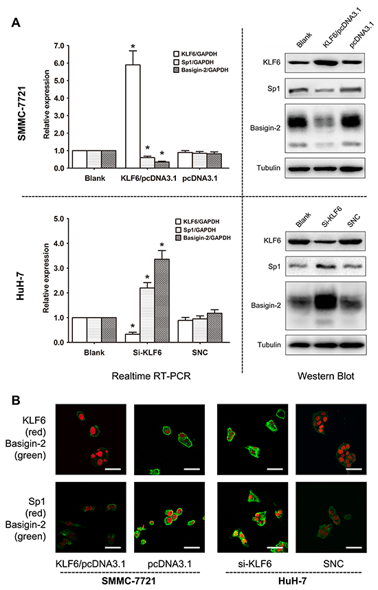 Figure 3: KLF6 negatively regulates Sp1 and basigin-2 expression. A. KLF6, Sp1, and basigin-2 mRNA and protein expression in cells transfected with corresponding overexpression vector (upper) or siRNAs (lower). *, P < 0.05, using Student’s t test. B. Expression of KLF6, Sp1, and basigin-2 in HCC cells transfected with overexpression vector or siRNA of KLF6, as detected by confocal laser scanning microscopy. Scale bars, 50 μm.