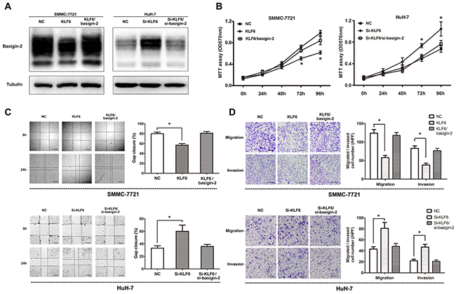 Figure 4: Overexpression of KLF6 inhibits the migration and invasion of HCC cell lines. A. Western blot analysis of basigin-2 expression in SMMC-7721 and Huh-7 cells treated with KLF6 plasmid or siRNA. B. Cell proliferation of these cells transfected as in (A) was measured in the indicated time periods using MTT proliferation assays. *, P < 0.05, two-way repeated measures ANOVA followed by the Bonferroni test. C. Wound-healing assays of SMMC-7721 and Huh-7 cells transfected as in (A), compared with control, at 24 h after transfection. Scale bars, 500 μm. *, P < 0.05, by one-way ANOVA followed by the Dunnett test. D. The inhibitory effect of KLF6 toward the invasion and migration of SMMC-7721 and Huh-7 cells. Scale bars, 200 μm. *, P < 0.05, by one-way ANOVA followed by the Dunnett test. KLF6/basigin-2 means to co-transfect basigin-2/pcDNA3.1 with KLF6/pcDNA3.1, whereas Si-KLF6/si-basigin-2 means to co-transfect si-KLF6 with si-basigin-2.