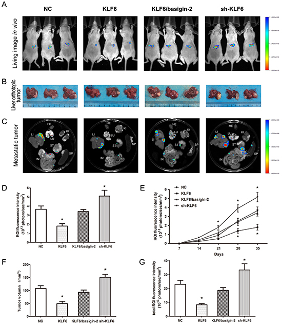 We next determined whether KLF6 overexpression could suppress tumor growth and metastasis in vivo. Using an orthotopic HCC model in nude mice, the negative control and KLF6/basigin-2 mice showed the apparent presence of GFP fluorescence emitted from primary tumor, whereas mice with KLF6 overexpression exhibited a lower GFP fluorescence signal at the observation endpoint. By contrast, knockdown of KLF6 expression significantly increased the GFP fluorescence signal (Figure 5A and 5D). The growth curve based on the data of living image repeated weekly revealed that the proliferation of KLF6 overexpressed tumors was slower than that of negative control. However, knockdown of KLF6 exhibited the fastest proliferation rate. Significant differences were observed between the fluorescence signals in KLF6 overexpressed mice and those in negative controls at days 28 and 35, and between the fluorescence signals in KLF6 knock-down mice and those in negative controls at days 21, 28 and 35 (P < 0.05; Figure 5E), suggesting that KLF6 exerted significant tumor growth suppression in vivo. All the mice were sacrificed after the last imaging, the tumors were excised and tumor volumes were measured. The KLF6 overexpressed mice had the smallest tumors, which were almost single tumors with no obvious live metastasis, whereas KLF6 knock-down mice presented the biggest tumors with multiple metastasis in liver (Figure 5B and 5F). We also compared tumor metastasis to important organs in these groups and were surprised to find that KLF6 overexpression resulted in obvious inhibition of distant metastasis to lung, omentum and mesenterium around stomach and small intestine (Figure 5C and 5G). Similarly, restoring of basigin-2 expression showed opposite effect on the growth, invasion and metastasis of HCC tumors compared with KLF overexpression mice (Figure 5). These findings suggest that KLF6 significantly inhibits proliferation, invasion and metastasis in HCC in vivo by down-regulating basigin-2.