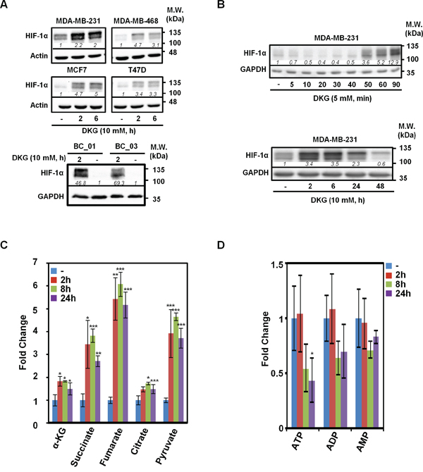 Figure 1: Dimethyl-2-ketoglutarate (DKG) induces HIF-1α and alters the metabolic profile in breast cancer (BC) cells. A. DKG stabilizes HIF-1α in multiple BC cells. HIF-1α levels in the DKG-treated BC cells (10 mM, 2 and 6 h) were assessed by western blot analysis. B. The induction of HIF-1α by DKG is fast and transient. HIF-1α levels in DKG-treated MDA-MB-231 cells were assessed by western blot analysis. C, D. Succinate and fumarate accumulate (C) and ATP is decreased (D) in DKG-treated cells. Metabolites in the MDA-MB-231 cells treated with DKG (10 mM, 0, 2, 8, 24 h) were analyzed by NMR spectroscopy. n = 3, *: p < 0.05; **: p < 0.01; ***: p < 0.005. (A, B) One representative blot from n = 3 is shown. Italic numbers indicate the relative protein level.