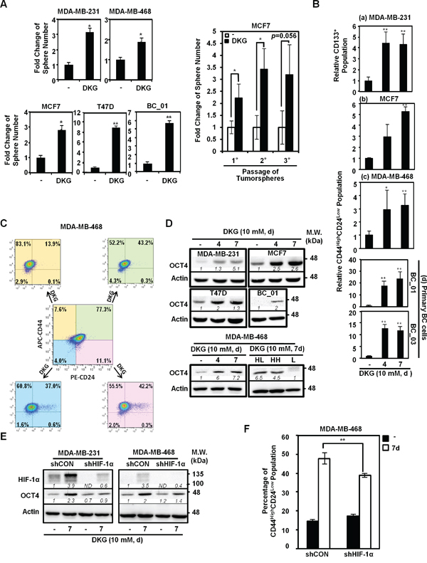 Figure 2: DKG promotes tumorigenic properties in BC cells. A. DKG pre-treatment promotes tumorsphere formation. Left panel: Quantification of tumorspheres formed by the untreated and DKG pre-treated BC cells. Right panel: In vitro serial passaging of tumorspheres formed by the untreated and DKG-treated MCF7 cells. *: p < 0.05; **: p < 0.01, n = 3. B. DKG regulates the abundance of cancer stem cell (CSC) surface markers in BC cells. Flow cytometric analyses of surface markers in DKG-treated BC cells (10 mM, 4, 7 days). CD133 was assessed in MDA-MB-231 cells (a). CD44 and CD24 were assessed in MCF7 (b), MDA-MB-468 (c) and primary BC cells (d). The percentage of CD133-positive or CD44HighCD24Low subpopulations in the untreated sample was set as 1. Bar graphs represent the mean ± SD, n = 3. C. DKG converts non-tumorigenic subpopulations to tumorigenic subpopulations. MDA-MB-468 cells were sorted based on CD44 and CD24 expression. Sorted cells were treated with DKG (10 mM, 7 days). CD44 and CD24 expression was assessed. APC: allophycocyanin-conjugated. PE: phycoerythin-conjugated. Representative graphs. n = 3. D. DKG elevates OCT4 abundance. Upper panel: OCT4 levels in multiple BC cell lines treated with DKG (10 mM for 4 or 7 days) were determined by western blot analysis. Lower panel: OCT4 is expressed in the CD44High subpopulations after DKG treatment. The DKG-treated MDA-MB-468 cells (10 mM, 7 days) were sorted into CD44HighCD24Low (HL), CD44HighCD24High (HH) and CD44Low (L) subpopulations for analyzing OCT4 expression by western blot analysis. Representative blots. n = 3. E. DKG-induced OCT4 expression depends on HIF-1α. F. HIF-1α is responsible for inducing a tumorigenic subpopulation in BC cells. **: p < 0.01, n = 3. (D, E) One representative blot from n = 3 is shown. Italic numbers indicate the relative protein level. ND: not detectable.