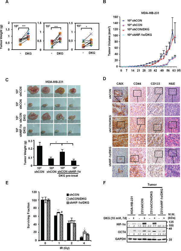 Figure 3: DKG augments the tumorigenic properties of BC cells in vivo. A. DKG enhances the growth of tumors in vivo. The untreated or DKG pre-treated MDA-MB-231 cells were injected subcutaneously in the left and right flank of the same NSG mouse in serial dilutions (104, 103, 102 cells). The plot shows the comparison of corresponding tumor weight (g), measured after harvesting on day 60, in the same mouse. *: p < 0.05; ***: p < 0.005, n = 8. B, C. DKG augments the tumorigenic properties of BC cells through HIF-1α in vivo. (B) Different numbers of MDA-MB-231/shCON or shHIF-1α cells with or without pre-treatment with DKG were injected into NSG mice. Tumor volume was measured twice weekly for 65 days and tumors were harvested on day 65. (C) Images show that pre-treatment with DKG boosted expansion of xenografted MDA-MB-231 cells in a HIF-1α-dependent manner (upper panel). Tumor weight (g) was measured after harvesting on day 65 and is shown as mean ± SD (lower panel). *: p < 0.05. n = 4. D. Pre-treatment with DKG increases CAIX abundance in xenografted tumors. Immunohistochemical (IHC) staining of CAIX, CD44, CD133 and H&E staining of the tumors. Bar: 50 μm. Insets show the enlargement of the indicated areas. E. DKG confers relative resistance of BC cells to irradiation. DKG-pre-treated xenografted MDA-MB-231/shCON and MDA-MB-231/shHIF-1α cells were subjected to a clonogenic survival assay followed by irradiation. Colonies were counted, corrected for plating efficiency and presented as the surviving fraction relative to untreated controls. *: p < 0.05; **: p < 0.01, shCON/DKG compared with shCON; #: p < 0.05, shCON/DKG compared with shHIF-1α/DKG. F. Harvested tumor cells from xenografted tumors are still responsive to DKG. HIF-1α and OCT4 levels in MDA-MB-231 cells harvested from xenografted tumors were assessed by western blot analysis. One representative blot from n = 3 is shown. Italic numbers indicate the relative protein level. ND: not detectable.