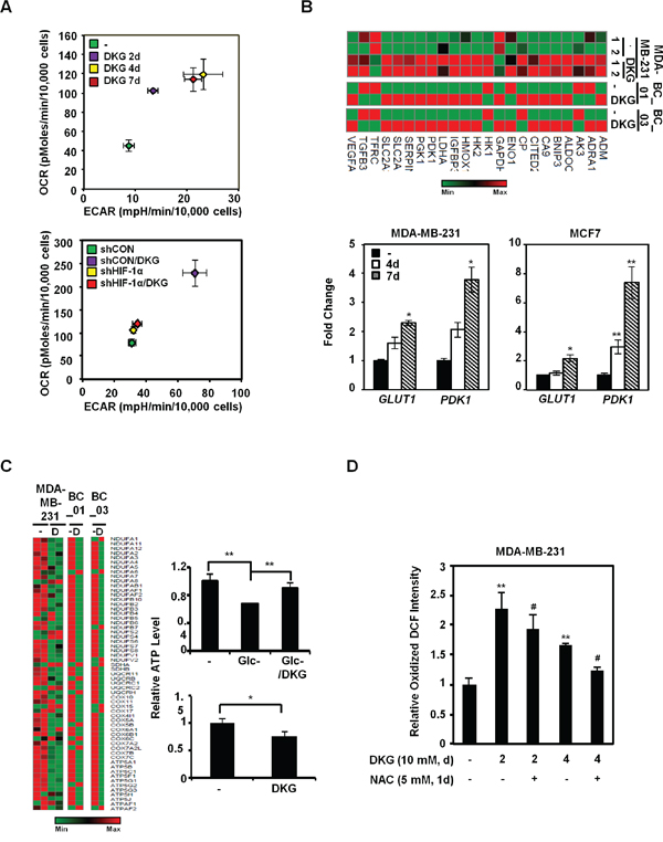 Figure 4: DKG enhances metabolic flux in BC cells. A. Energy metabolism is enhanced by DKG-induced HIF-1α in MDA-MB-231 cells. The oxygen-consumption rate (OCR) and extracellular acidification rate (ECAR) were measured during the course of DKG treatment in MDA-MB-231 cells (upper panel) and in MDA-MB-231/shCON versus MDA-MB-231/shHIF-1α cells (lower panel). The PhenoGram profiles show the metabolic switch of OCR and ECAR at the sixth point (22.5 mins after Glc injection during the ECAR measurement) for the ECAR versus OCR plots, as shown in Figures S3A and S3B; n = 3. B. DKG increases the message abundance of genes regulating glucose metabolism. Upper panel: heat map generated from RNA-seq analysis of the untreated and DKG-treated MDA-MB-231 cells and primary BC cells. Lower panel: qRT-PCR analysis revealed that glucose transporter 1 (GLUT1) and pyruvate dehydrogenase kinase 1 (PDK1) mRNA levels are elevated in DKG-treated MDA-MB-231 cells (10 mM, 4, 7 days). *: p < 0.05; **: p < 0.01, n = 3. C. Genes regulating the mitochondrial electron transport chain are reduced by DKG treatment. Left panel: heat map generated from RNA-seq analysis. Right panel: MDA-MB-231 cells were cultured in Glc-depleted medium (upper right panel) or Glc-complete (25 mM) medium (lower right panel) supplemented with or without DKG for 48 h. The ATP levels were measured using a luciferase assay. *: p < 0.05; **: p < 0.01. n = 3. D. The levels of reactive oxygen species (ROS) increase in DKG-treated cells. ROS levels were measured by DCFDA staining. The oxidized DCF signal is shown. **: p < 0.01 (DKG-treated vs. untreated); #: p < 0.05 (DKG+NAC vs. DKG only), n = 3.