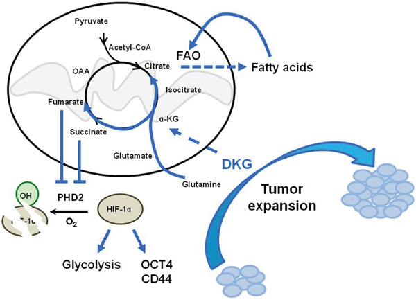 The current studies reveal an important, but counterintuitive, ability of DKG to trigger a combined metabolic and transcriptional response, promoting a tumorigenic phenotype. DKG has been widely used as an analogue of α-KG, which is important for the TCA cycle, fatty acids and glutamine metabolism, and α-KG-dependent enzyme function. Therefore, one might suspect that an α-KG analogue would increase PHD enzyme function and de-stabilize HIF-1α. However, because DKG also increases the succinate and fumarate levels, the overall ratio of succinate/fumarate to α-KG remains high and PHD enzymes are inhibited, thereby increasing HIF-1α levels.
