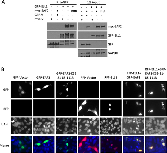Figure 4: Mutant EAF2K39-81-85-111R binding and co-localization with ELL1. (A) HEK 293 cells were transfected with myc-EAF2, myc-EAF2K39-81-85-111R, or empty myc expression vector together with GFP-ELL1 or empty GFP expression vector for 36 h. The cell lysates were prepared for co-immunoprecipitation using anti-GFP antibody. The precipitates and whole cell lysates (1% input) were analyzed by immunoblotting using anti-myc and anti-GFP antibodies. GAPDH in the whole cell lysates was probed as loading control. (B) C4-2 cells were transfected with GFP, GFP-EAF2, GFP-EAF2K39-81-85-111R, RFP, and RFP-ELL1 expression vector alone or in the indicated combinations for 48 h. Subcellular localization was imaged with confocal microscopy. Image enlargement: 100×. Data shown are representative of three independent experiments.