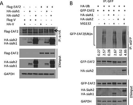 Figure 5: E3 ligase SIAH2 interaction with EAF2 protein. (A) HEK 293 cells were transfected to express flag-EAF2, together with HA-tagged SIAH1 or SIAH2 for 30 h. Then cells were treated with MG132 (10 μM) for an additional 18 h. EAF2 was isolated from denatured cell lysates by anti-HA immunoprecipitation, followed by immunoblotting of the precipitates. The precipitated Flag-EAF2 (indicated by an arrow) and HA-SIAH1/2 were detected with anti-flag and anti-HA antibodies, respectively. Whole cell lysates were also immunoblotted to detect the expression of transfected flag-EAF2 and HA-SIAH1/2. (B) HEK 293 cells were co-transfected to express GFP-EAF2, HA-tagged ubiquitin, and HA-tagged SIAH1 or SIAH2 for 30 h. Then cells were treated with MG132 (10 μM) for an additional 18 h. GFP-EAF2 was isolated from denatured cell lysates by anti-GFP immunoprecipitation, followed by immunoblotting of the precipitates. GFP-EAF2 and HA-SIAH1/2 were detected with anti-GFP, anti-SIAH1 or SIAH2 antibodies, respectively. The numbers below the Western image indicate the relative intensity of polyubiquitinated GFP-EAF2, which were quantified using ImageJ (NIH). GAPDH was immunoblotted as a loading control. Data shown are representative of three independent experiments.