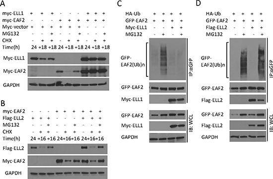 Figure 6: The effect of ELL1 and ELL2 on EAF2 stability and ubiquitination. (A) Myc-EAF2, myc-ELL1 or empty myc vector were transfected into C4-2 cells alone or in combination as indicated for 24 h. Then cells were treated with CHX (50 μg/ml) with or without MG132 (5 μM) for additional 18 h. Cell lysates were analyzed by immunoblotting for EAF2 (anti-myc) and ELL1 (anti-myc). (B) Myc-EAF2, flag-ELL2 or empty myc vector were transfected into C4-2 cells alone or in combination for 24 h. Then cells were treated with CHX (50 μg/ml) with or without MG132 (5 μM) for additional 16 h. Cell lysates were analyzed by immunoblotting for EAF2 (anti-myc) and ELL2 (anti-Flag). (C and D) GFP-EAF2 and HA-ubiquitin were co-transfected into HEK 293 cells with or without the transfection of myc-ELL1 (C) or flag-ELL2 (D). After 30 h, cells were treated with or without MG132 (10 μM) for additional 18 h. EAF2 was isolated from denatured cell lysates by anti-GFP immunoprecipitation, followed by immunoblotting of the precipitates. HA-ubiquitin, GFP-EAF2, flag-ELL2 and myc-ELL1 were detected by anti-ubiquitin, anti-GFP, anti-flag and anti-myc antibodies, respectively. GAPDH was immunoblotted as a loading control. Data shown are representative of three independent experiments.