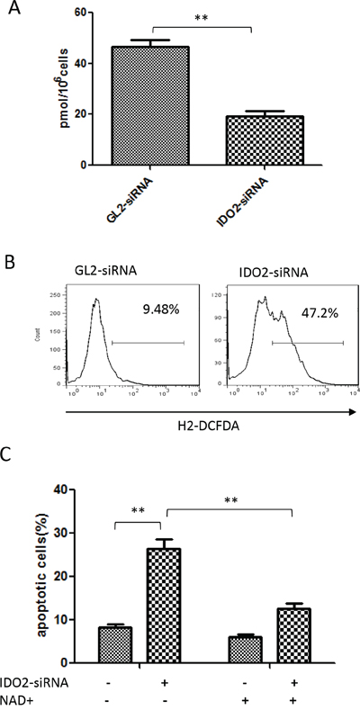 Figure 3: Gene silencing of IDO2–induced apoptosis is associated with suppression of NAD+ generation and upregulation of ROS in B16-BL6 cells. A. Gene silencing of IDO2 decreased intracellular NAD+. B16-BL6 cells were transfected with IDO2 or GL2 siRNA for 48 h, or remained untransfected as blank control. NAD+ levels were measured as described in Materials and Methods. Bars indicate the mean of three independent measurements ± SD (**p≤0.01). B. Intracellular ROS increased in IDO2-silenced cells. B16-BL6 cells were transfected with IDO2 or GL2 siRNA for 48 h. ROS levels in different groups were measured by dichlorofluorescein assay and detected by flow cytometry. C. Exogenous NAD+ can relieve the apoptosis induced by IDO2 gene silencing. B16-BL6 cells were transfected with IDO2 or GL2 siRNA for 4 h, then treated with 100 μM NAD+. Cell apoptosis was measured 48 h after treatment with NAD+, as described in Figure 2A. Bars indicate the mean of three independent measurements ± SD (**p≤0.01).