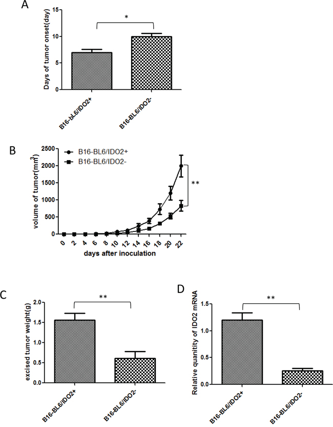 Next we investigated the effect of differential expression levels of IDO2 in tumor cells on tumor formation and growth in vivo. We observed that tumor onset in IDO2 shRNA stable cells (B16-BL6/IDO2-) injected mice was substantially postponed compared with mice injected with scrambled shRNA cells (B16-BL6/IDO2+) (Figure 4A). In addition to tumor onset time, we found that tumor growth was constrained in IDO2 shRNA stable cells injected mice compared with scrambled shRNA stable cells injected mice (Figure 4B). At the end point of the observation, tumor tissues were excised and weighed. The mass of tumors derived from IDO2 shRNA stable cells was much smaller than those from the scrambled shRNA stable cell injected mice (Figure 4C). Furthermore, we found that IDO2 expression in IDO2 shRNA tumor tissue still maintained 80% gene silencing 22 days after cell inoculation (Figure 4D).