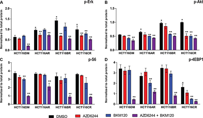 Figure 1: Pathway signaling levels of AQR cell lines. Phosphorylation levels of (A) Erk, (B) Akt, (C) S6 and (D) 4EBP1 at 24 h post-treatment in HCT116DM, HCT116AR, HCT116BR and HCT116CR cells treated with vehicle (DMSO), AZD6244 alone (IC50 concentration), BKM120 alone (IC50 concentration), and their combination (IC50 + IC50 concentration). Levels were measured by ELISA. All experiments were repeated three times, and data are displayed as mean ± standard deviation of phosphorylated protein normalized to total protein. *indicates p < 0.05 compared to levels in HCT116DM. **indicates p < 0.05 compared to the control levels in the treated cell lines.