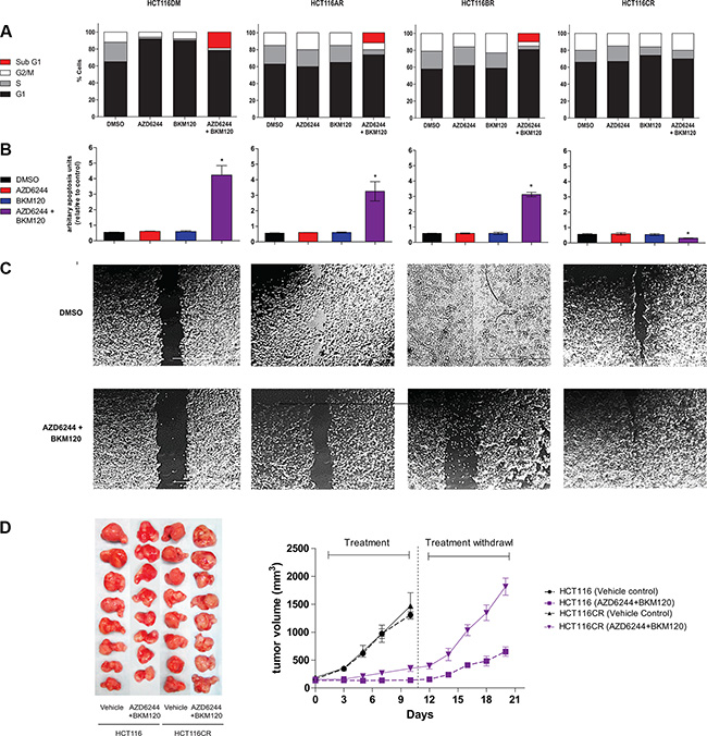 Figure 2: In-vitro and in-vivo phenotypes of AQR cell lines. (A) Cell cycle phase distribution of cells at baseline and 24 h after exposure to IC50 concentrations of AZD6244 alone, BKM120 alone and AZD6244 and BKM120 combined. (B) Apoptosis of cells at baseline and 24 h after exposure to IC50 concentrations of AZD6244 alone, BKM120 alone and AZD6244 and BKM120 combined. *indicates p < 0.05 compared to cells treated with vehicle (DMSO). (C) Phase contrast images of cells in the wound-healing assay at baseline and 24 h after exposure to IC50 concentrations of AZD6244 alone, BKM120 alone and AZD6244 and BKM120 combined. (D) Images of tumors (left panel) and a chart of tumor volume over time (right panel) of tumors established from HCT116DM or HCT116CR cells in male SCID mice as described in online methods. All experiments were repeated three times, and data are displayed as mean ± standard deviation where relevant.