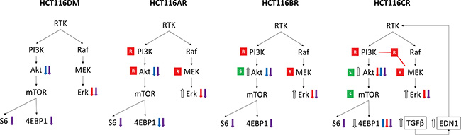 Figure 4: Overview of differences in phenotypes of AQR cells. An increase (⇑) or decrease (⇓) in phosphorylation levels at baseline is indicated by white arrows. An increase (⇑) or decrease (⇓) in phosphorylation levels post-treatment are indicated by colored arrows, according to treatment with AZD6244 alone (red), BKM120 alone (blue) and their combination (purple). Resistance (red box with white R) and sensitivity (green box with white S) to inhibitors of respective proteins in drug sensitivity analysis are also indicated. Also indicated is the increased expression of EDN1 and TGFB2 that was observed uniquely in HCT116CR cells, and its hypothesized activation of pathway signaling.