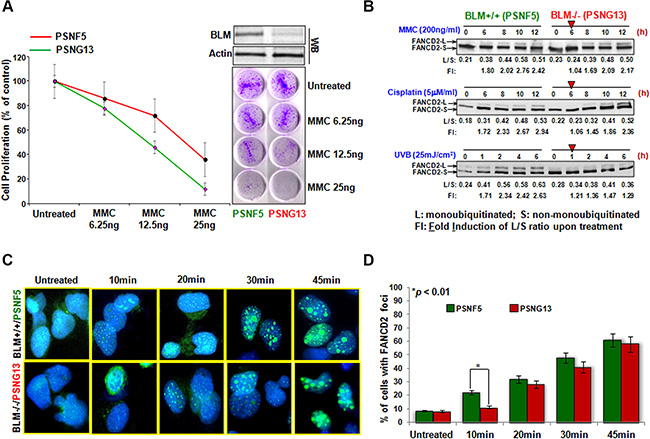 Figure 1: FANCD2 activation is sharply mitigated in BS cells. (A) BS cells are sensitive to MMC treatment. Both BLM proficient (PSNF5) and deficient (PSNG13) cells were treated with the indicated concentration of MMC. PSNG13 (BLM deficient) cells were more sensitive to the treatment of MMC than BLM proficient cells. (B) The magnitude of FANCD2 activation is reduced in BS cells treated with MMC, Cisplatin and UVB. We treated both the BLM proficient (PSNF5) and deficient (PSNG13) cells with MMC (200 ng/ml; top panel), Cisplatin (5 μM/ml; middle panel) and UVB (25 mJ/cm2; bottom panel) respectively, and harvested cells at the indicated time points. Whole cell extracts were used to conduct Western blotting with anti-FANCD2 antibodies. As red arrowheads indicated, BLM deficient cells showed a delayed activation of FANCD2 as compared to BLM proficient cells. The band density was determined by Image J software, and the ratio of FANCD2-L (monoubiquitinated FANCD2 isoform) to FANCD2-S (un-monoubiquitinated form) was calculated (L/S). Fold induction (FI) is the L/S ratio of the treated over the untreated.(C) FANCD2 foci are reduced in BS cells. The same batch of UVC-treated cells (Supplementary Figure S1A) were also prepared for the immunofluorescent study of FANCD2 monoubiquitination/activation. BLM deficient cells carry a lower number of FANCD foci compared to BLM proficient cells (Foci represent the monoubiquitinated FANCD2) (images were taken at a magnification of 400X). (D) Quantification of FANCD2 focus formation. The number of nuclei positive for FANCD2 foci was measured in 120 cells for each time point. The graph shows the mean and SD of the percentage of cells with > 10 FANCD2 foci. Statistical significance was calculated using the Pearson’s Chi-square test. Data are the means of 3 independent determinations.
