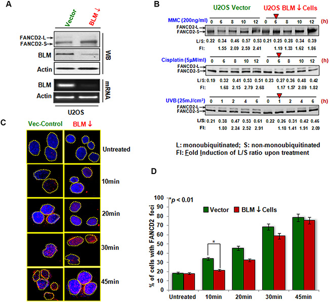 Figure 2: The regulation of FANCD2 activation by BLM in non-BS human cancer cells. (A) U2OS cells carrying shRNA targeting Blm or empty vector were established. The levels of both BLM mRNA and protein were downregulated compared to control cells. The corresponding level of monoubiquitinated FANCD2 is compromised in BLM-downregulated cells. U2OS stable cells isogenic to the basal level of monoubiquitinated FANCD2 expression were established via silencing FANCL. (B) FANCD2 activation is compromised in BLM-deficient U2OS cells. As red arrowheads indicated, BLM-downregulated cells showed a clear delayed activation of FANCD2 as compared to their corresponding control cells. L/S ratio is the level of S (un-monoubiquitinated) over L (monoubiquitinated) forms of FANCD2. Fold induction (FI) is the L/S ratio derived from the treated over the one from untreated cells. (C) FANCD2 foci in BLM-silenced U2OS cells are decreased. The same batch of U2OS stable cells, used for Western blotting in A, was also prepared for the immunofluorescent study of monoubiquitinated FANCD2. Cells were treated with UVC (50 J/m2) as described in the Materials and Methods. Again, BLM-downregulated cells carry a lower density of FANCD foci compared to vector cells (Foci represent the monoubiquitinated FANCD2). (D) Quantification of FANCD2 focus formation. The number of nuclei positive for FANCD2 foci was measured in 120 cells for each time point. The graph shows the mean and SD of the percentage of cells with > 10 FANCD2 foci. Statistical significance was calculated using the Pearson’s Chi-square test. Data are the means of 3 independent scores.
