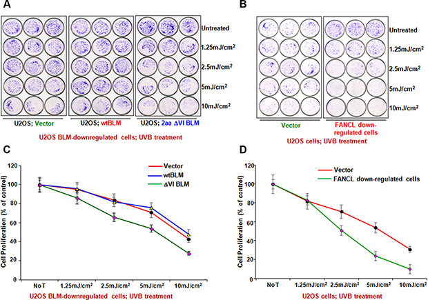 Figure 4: Biological significance of BLM Regulation through FANCD2 Activation. (A) BLM-downregulated or (B) FANCL-downregulated U2OS cells were more sensitive to UVB treatment than their corresponding control cells. This is similar to what is seen in these cells treated with MMC (Supplementary Figure S3A and S3B). Representative results of at least three independent experiments assessed by crystal violet staining are shown and the survival curves plotted upon the quantification of cell proliferation are shown in (C and D) respectively (Means ± SD of 3 independent experiments). The asterisks denote *P < 0.05.