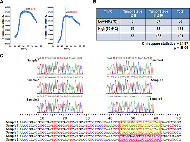 To explore an immediate opportunity for prevention and diagnosis of DNA damage-related diseases including UV-driven skin cancers, we modified the conventional TaqMan assay at the annealing stage to differentiate the peaks of probe fluorescence bound to wt and mt templates (Blm cDNA) respectively (Figure 5A) (the probe sequence was designed upon the Y974Q975 region of BLM: FAM-GGTTACTACCAAGAATCT). As anticipated, wtBlm cDNA showed a peak annealing temperature of 52.6°C; while ΔY974Q975 Blm cDNA optimally bound to the probe at 46.8°C. This probe was subsequently used to detect mutations occurring at the Y974Q975 region of BLM in human cancer. We used this modified TaqMan method to examine 191 human ovarian cancer cDNA samples with a clear documentation of tumor stage and grade [34–36]. We found that the TaqMan probe could anneal to the PCR products of ~60 samples with a Tm around 47°C, and the rest of the samples with a Tm around 53°C. Among the low-Tm-carrying samples, the majority were derived from high-stage tumors; whereas in high-Tm-carrying samples, only half were derived from the high-stage tumors. When Chi-square is applied, high or low-Tm is reversely associated with tumor stages with a p value of 1E-06 (Figure 5B). We also randomly picked up several sample PCR-products for sequencing, and found that the low-Tm carrying samples indeed harbor mutations in the region examined, and that the high-Tm-carrying samples matched well with the wt sequence (Figure 5C). This is a very exciting finding, because these results may lead to a potential in predicting ovarian cancer grade/stage at the genetic level. In addition, UV damage is the primary cause of skin cancer. Clinically, skin cancer patients are seen primarily in the setting of a dermatologist’s office lacking sequencing equipment for testing. Therefore, there is a large unmet need for a rapid diagnosis of pre-lesions of UV-driven cancer. As such, PCR-based tests would be considerably more cost effective compared to genome sequencing. Importantly, this finding further shows the functional importance of the BLM domain VI in human tumorigenesis, and that compromised FA signaling can be a strong contributor to the tomorigenicity originating from the mutated Blm gene.