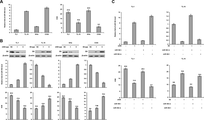 Figure 1: A decrease in MiR-184 level by E6 oncoprotein confers cisplatin resistance. (A) Expression levels of miR-184 were evaluated by real-time PCR in four cancer cell lines. The cell viability was determined by the MTT assay after the Cells were treated with or without cisplatin (0, 2, 4, 8, 16, 32 μM) treatment for 48 h for calculation of the IC50 value. (B) shE6 plasmids were transfected into E6-positive cell lines (TL-1 and SiHa) compared with both cell types transfected with a non-specific shRNA (NC), E6 expression vector were transfected into E6 negative (TL-10 and C33A) cell lines compared with both cell types transfected with an empty vector (VC). After 24 h, the indicated cells were incubated with or without cisplatin (0, 2, 4, 8, 16, 32 μM) for 48 h and then the change of IC50 value by E6 manipulation was determined by the MTT assay. The cell lysates were separated by SDS-PAGE for the evaluation of E6 expression by specific antibodies using western blotting. The miR-184 level was determined by real-time PCR. (C) TL-1 and SiHa cells were treated with shE6 shRNA (5 μg) and/or miR-184 mimic (m, 40 nM). TL-10 and C33A cells were treated with E6 expression vector (5 μg) and/or miR-184 inhibitor (i, 40 nM). After 24 h, the indicated cells were incubated with or without cisplatin (0, 2, 4, 8, 16, 32 μM) for 48 h and the change of IC50 value by E6 manipulation and/or miR mimic or inhibitor was determined by the MTT assay.
