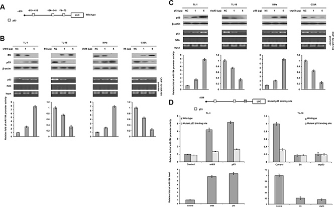 Figure 2: The miR-184 promoter activity is directly regulated by wild-type p53. (A) Diagram summarizing the positions of the p53 putative binding sites on the miR-184 promoter constructs predicted by a software analysis. (B) shE6 plasmids were transfected into E6-positive TL-1 and SiHa cells compared with those transfecting a non-specific shRNA (NC). On the other hand, E6 expression vector were transfected into E6-negative TL-10 and C33A cells compared with those transfecting an empty expression vector (VC). The cell lysates were separated by SDS-PAGE for the evaluation of E6 expression by a specific antibody using western blotting. A ChIP assay was performed to evaluate the binding ability of p53 onto the miR-184 promoter. The products were amplified by PCR. Luciferase reporter assay was performed to evaluate the miR-184 promoter activity in both cell types by transfecting the miR-184 promoter (–839/+1). (C) shE6 plasmids were transfected into E6-positive TL-1 and SiHa cells compared with their NC cells. On other hand, the shp53 were transfected into E6-negative TL-10 and C33A cells compared with their VC cells. The cell lysates were separated by SDS-PAGE for the evaluation of protein expression by specific antibodies using western blotting. A ChIP assay was performed to evaluate the binding ability of p53 onto the miR-184 promoter. The products were amplified by PCR. Luciferase reporter assay was performed to evaluate the miR-184 promoter activity in both cell types by transfecting the miR-184 promoter (–839/+1). (D) The miR-184 promoter (–839/+1) containing wild-type- or mutant p53-binding sites were transfected into TL-10 and C33A cells and then co-transfected with wild-type p53 (5 μg), E6 expression vectors (5 μg), shp53 (5 μg) and/or shE6 shRNA (5 μg). Luciferase reporter assay was performed to evaluate the reporter activity of miR-184 promoter (–839/+1). The miR-184 level was determined by real-time PCR.