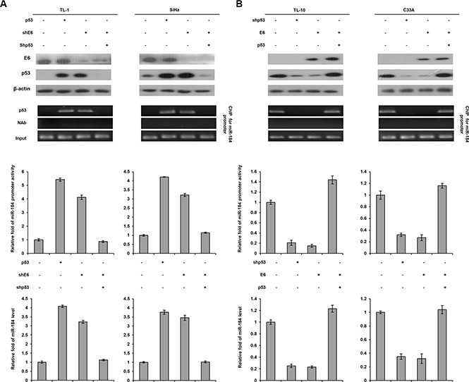 Figure 3: MiR-184 expression is down-regulated by E6 oncoprotein at transcription level via decreased the binding activity of p53 onto the miR-184 promoter due to p53 degradation by E6. (A) TL-1 and SiHa cells were treated with miR- 184 promoter reporter plasmid (–839/+1), wild-type p53 expression vector (5 μg), shp53 (5 μg), and/or shE6 shRNA (5 μg). (B) TL-10 and C33A were treated with the miR-184 promoter reporter plasmid (–839/+1), shp53 shRNA (5 μg), wild-type p53 (5 μg), and/or E6 expression vectors (5 μg). The cell lysates were separated by SDS-PAGE for the evaluation of protein expression by specific antibodies using western blotting. A ChIP assay was performed to evaluate the binding ability of p53 onto the miR-184 promoter. The products were amplified by PCR. Luciferase reporter assay was performed to evaluate the reporter activity of miR-184 promoter (–839/+1). The miR-184 level was determined by real-time PCR.