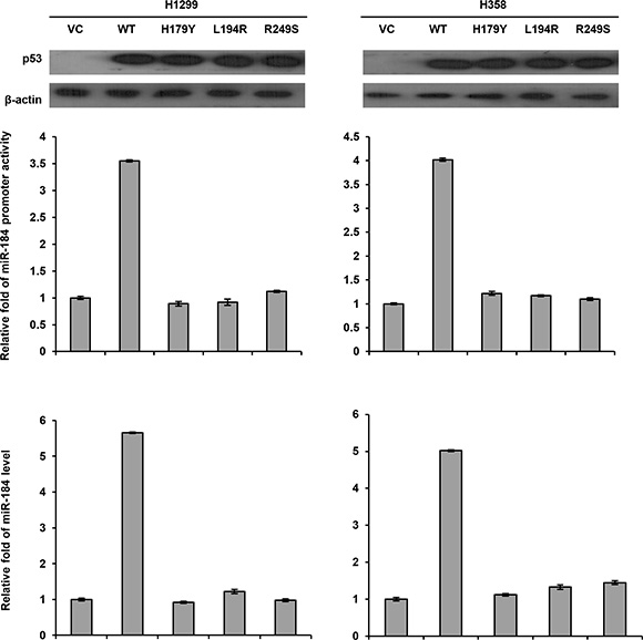 Figure 4: The miR-184 promoter activity is dependent on p53 status. A wild-type p53 or different mutant p53 expression vectors (5 μg) and the miR-184 promoter reporter plasmid were transfected into H1299 and H358 cells and the then cells lysates were separated by SDS-PAGE for the evaluating p53 expression by western blotting using a specific antibody. Luciferase reporter assay was performed to evaluate the reporter activity of miR-184 promoter (–839/+1). The miR-184 level was determined by real-time PCR.